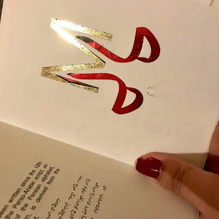I have created a mockup version of my language book which uses foiling on all of the double page spreads (on the letter pattern page). Some of the pages turned out better than others, but hopefully this won't be an issue when I foil the final book properly. I also used the antique white paper for these mockup pages. I am happy with how they turned out.